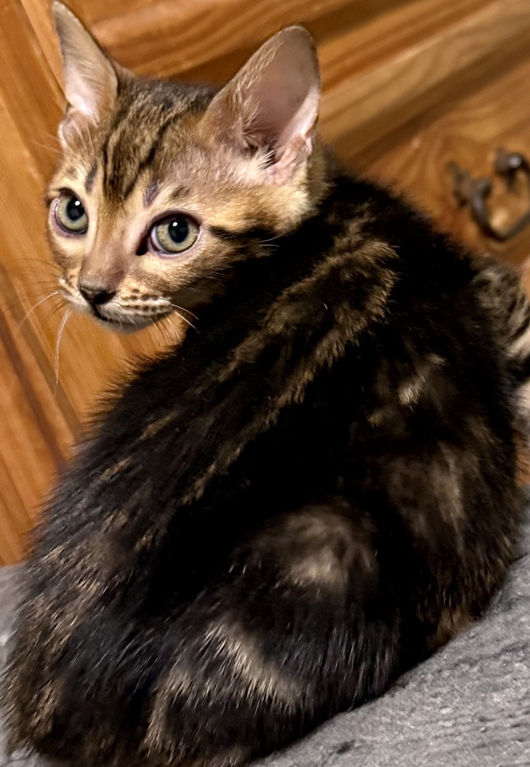 She’s one of those kittens that gets more beautiful with time. Her pattern will continue to develop and change as she grows, which is one of the most unique traits of marble Bengals.