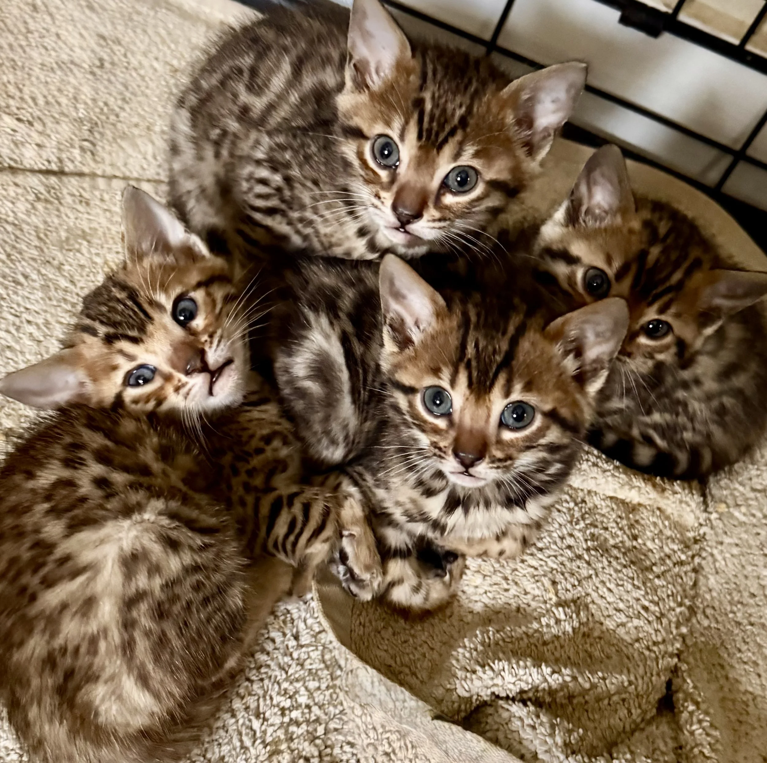 She tends to observe first, then quietly join in, and has a more easygoing, steady personality compared to some of the others. She’s been raised in our home with daily interaction and is well on her way to being a confident, well-socialized kitten.