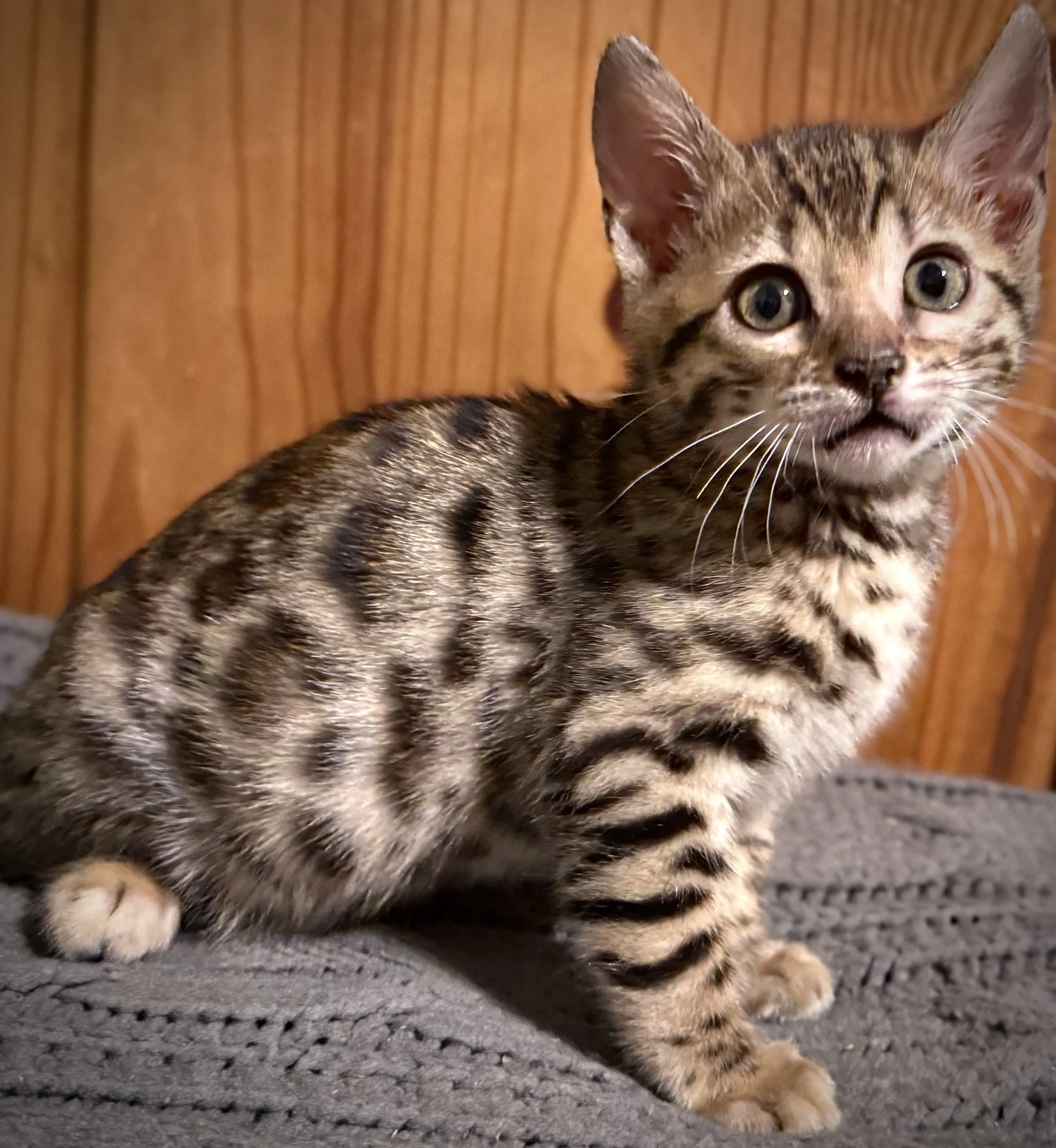 Her rosettes are already well-defined with strong contrast, giving her that classic wild Bengal look that continues to sharpen as she grows.